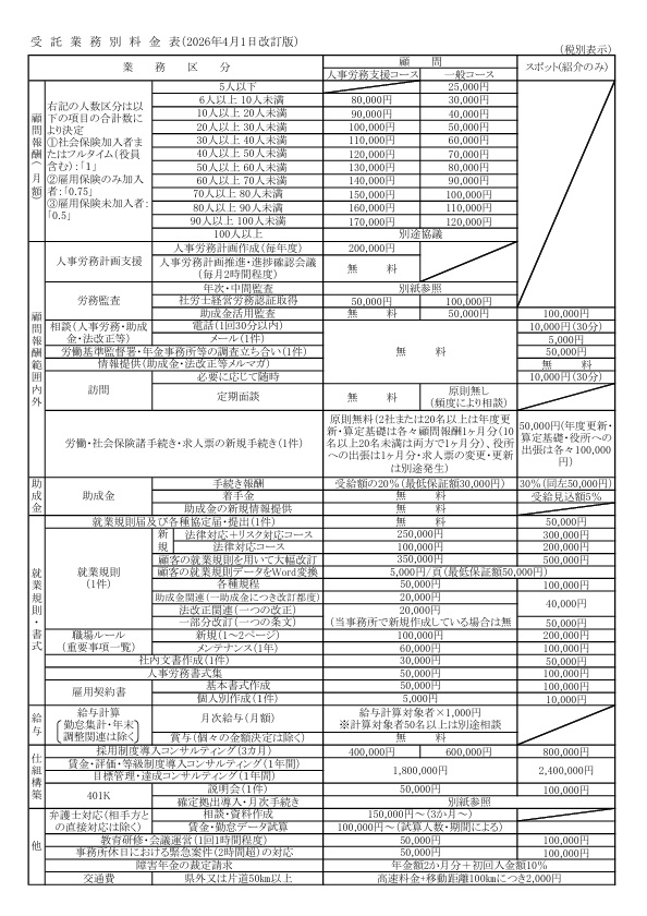 ※助成金の申請に合わせて就業規則・人事評価制度などを作成・変更した場合は別途費用を請求させていただきます。なお、それらの請求時期は就業規則等の完成後となりますので助成金申請費用の請求より早い時期となります。